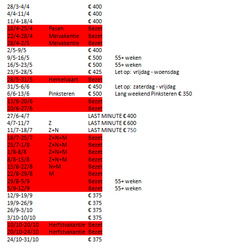 Buiten schoolvakanties om is de huur voor een weekend € 150,- exclusief overnachtingskosten.