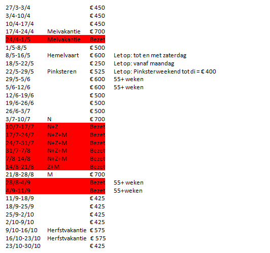 De huurprijzen via ons voor 2026 zijn bekend. Voor een overzicht zie de lijst onder aan deze pagina. Prijzen zijn exclusief overnachtingskosten en boekingskosten van de camping.